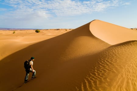 À proximité du village de Merzouga s’étend l’Erg Chebbi, un désert de dunes spectaculaire, emblématique du paysage Marocain. Les dunes de l’Erg Chebbi sont parmi les plus hautes du pays et peuvent atteindre jusqu'à 150 mètres. Elles s’étendent sur plusieurs dizaines de kilomètres où diverses activités sont proposées : trek, randonnées, promenades dans le sable. Le meilleur pour la fin : observer le coucher du soleil sur les dunes qui prennent alors des teintes orange vif ou rouge profond. Vous pouvez y passer une nuit en bivouac sous les étoiles, pour profiter du silence et de la quiétude du désert marocain.